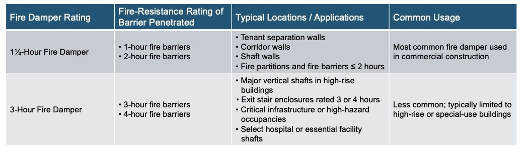 Most commercial buildings utilize 1½-hour fire dampers for the majority of duct penetrations.