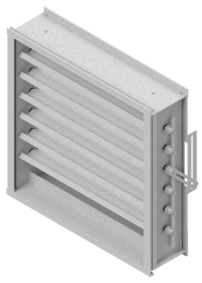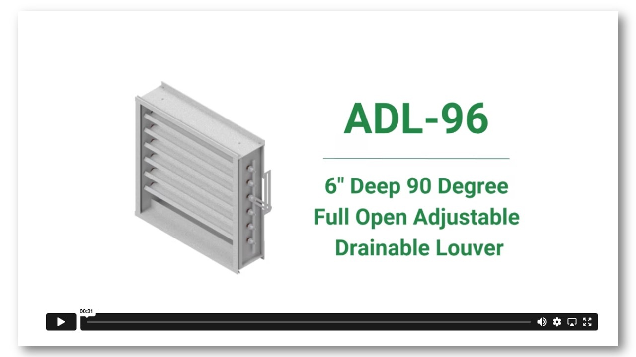 The new ADL-96 is a 6" deep, 90-degree, full open adjustable drainable louver. The blades in this louver can be positioned from 0 to 90 degrees, and it has been tested at the normal position of 37 degrees as well as the full-open position of 90 degrees. It is AMCA certified for air performance and water penetration.